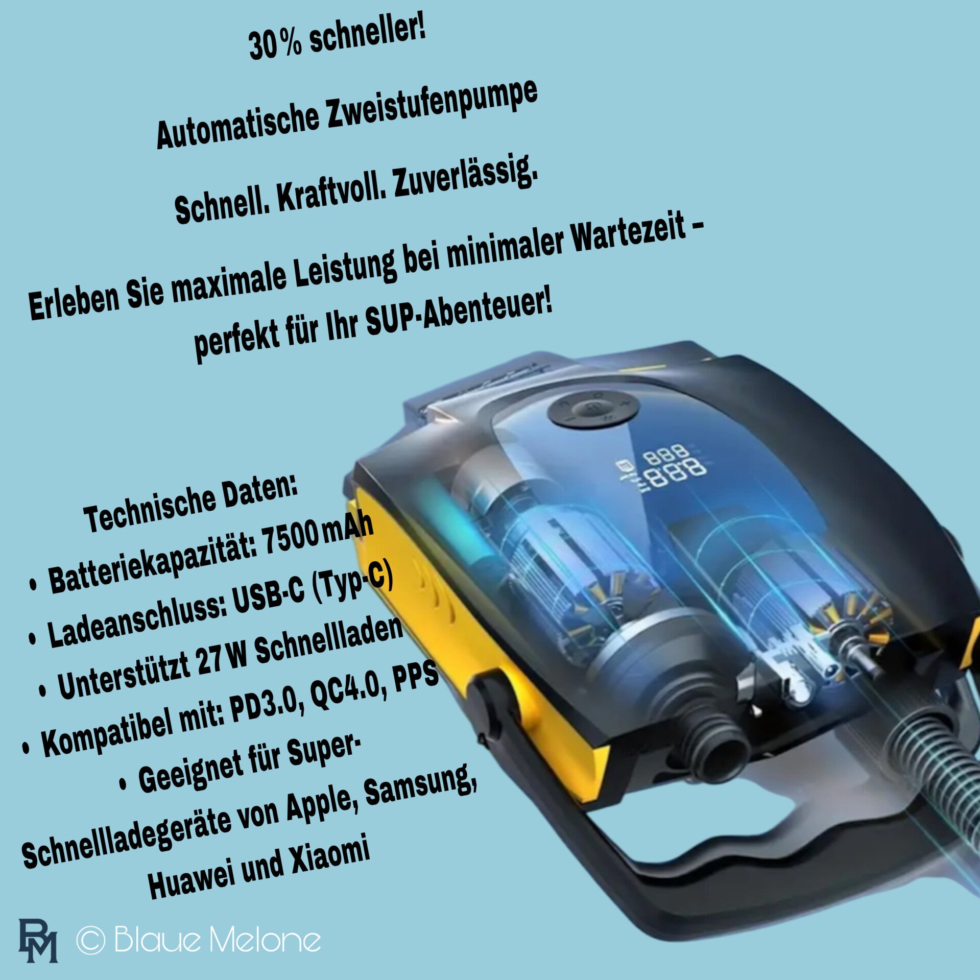 - Reise-Essential, FreeLionVon Tragbare Elektrische Luftpumpe mit eingebautem 7500mAh-Akku, zwei Druckeinstellungen (bis zu 50 PSI), ideal für SUP-Boards, Kajaks, Luftmatratzen, Reifen – Schwarz und Gelb, USB-Aufladung, FreeLionVon